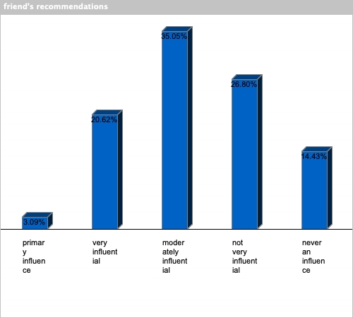 | friend's recommendations | 3.09% | 20.62% | 35.05% | 26.8% | 14.43% |