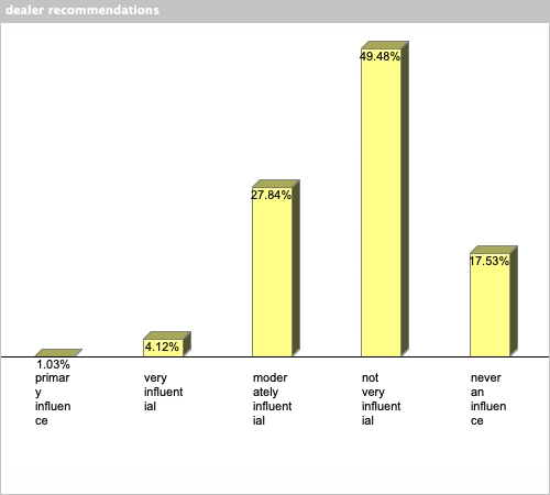 | dealer recommendations | 1.03% | 4.12% | 27.84% | 49.48% | 17.53% |