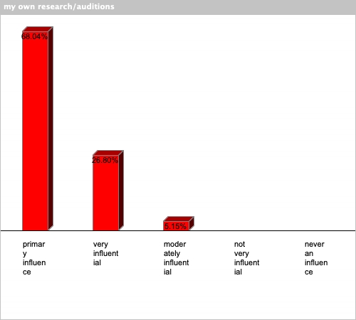 | my own research/auditions | 68.04% | 26.8% | 5.15% | 0% | 0% |