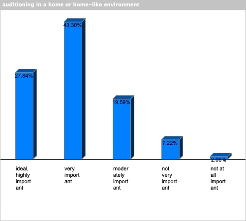 | auditioning in a home or home-like environment | 27.84% | 43.3% | 19.59% | 7.22% | 2.06% |