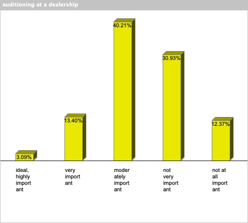 | auditioning at a dealership | 3.09% | 13.4% | 40.21% | 30.93% | 12.37% |