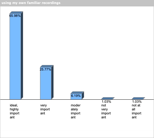 | using my own familiar recordings | 65.98% | 25.77% | 6.19% | 1.03% | 1.03% |
