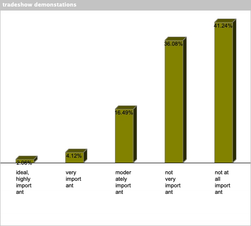 | tradeshow demonstations | 2.06% | 4.12% | 16.49% | 36.08% | 41.24% |