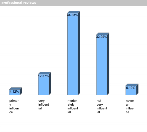 | professional reviews | 4.12% | 12.37% | 44.33% | 32.99% | 6.19% |
